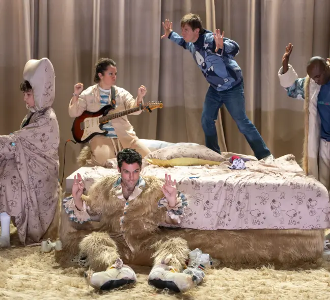 La mise en scène regorge également d’humour : costumes délirants entre pyjamas, costumes de scène et tenues décontractées, on voyage entre plusieurs réalités. Cette extravagance se retrouve dans les choix scénographiques : presque toute la pièce se déroule dans la chambre de Sylvain, chambre physique comme métaphorique. Le lit refuge est aussi le lieu de naissance des fantaisies de l’adolescent, son bureau se transforme en piano et sa couverture de cheveux roux où il s’enveloppe comme dans un cocon. Toutes ces jolies trouvailles apportent un délicieux onirisme.