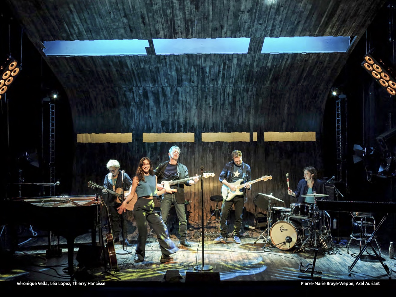 Le public est accueilli devant une scène remplie d’instruments : piano, guitares, basse, batterie, clavier… qui évoque une scène dans un bar, une réunion d’amis qui viendraient faire un bœuf ensemble et se raconter leur vie. Sauf qu’à la Comédie-Française, cela n’a rien d’une discussion de comptoir. Sur cette scène du Studio-Théâtre, viennent prendre place cinq interprètes : la rayonnante Léa Lopez, l’incomparable Thierry Hancisse, l’émouvante Véronique Vella, le déroutant Axel Auriant guidé et accompagnés par le musicien Pierre-Marie Braye-Weppe.
