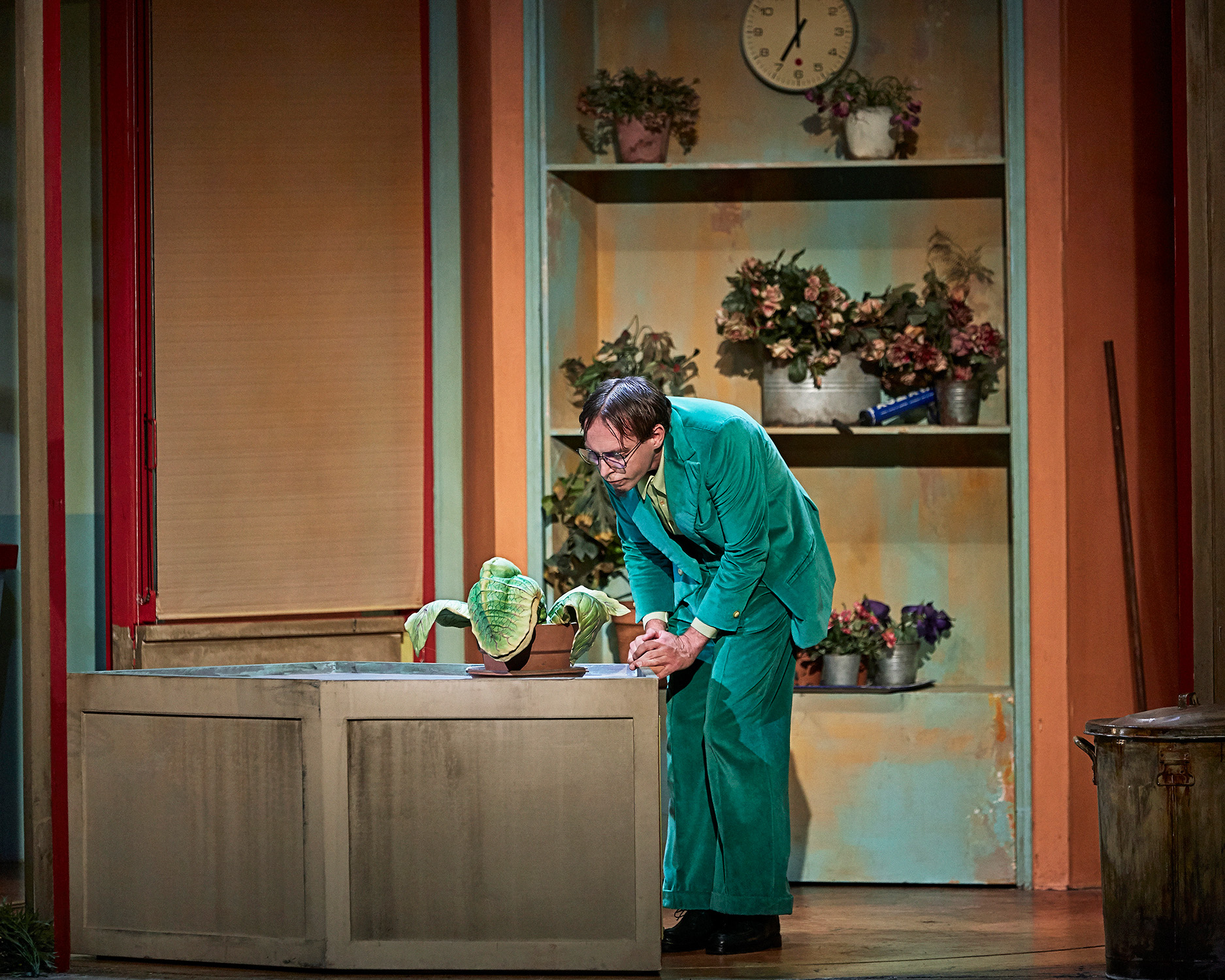Pour compléter ce cocktail hétéroclite, la mise en scène est signée Valérie Lesort et Christian Hecq (Les Voyages de Gulliver, La Mouche). L’attention qu’ils ont portée à la qualité plastique du spectacle est incontestable : visuellement, on retrouve un imaginaire visuel digne d’un cartoon. Les petits détails transforment un décor statique en source de surprises où rien n’est superflu : chaque accessoire même insignifiant possède son rôle dans la narration et contribue à manifester visuellement le succès croissant de la boutique Mushnik & Fils. La boutique est une petite merveille de décor : modulable, elle permet de limiter les passages au noir au strict minimum et d’intégrer avec fluidité les changements de marionnette végétale pour la plus grande surprise des spectateurs.