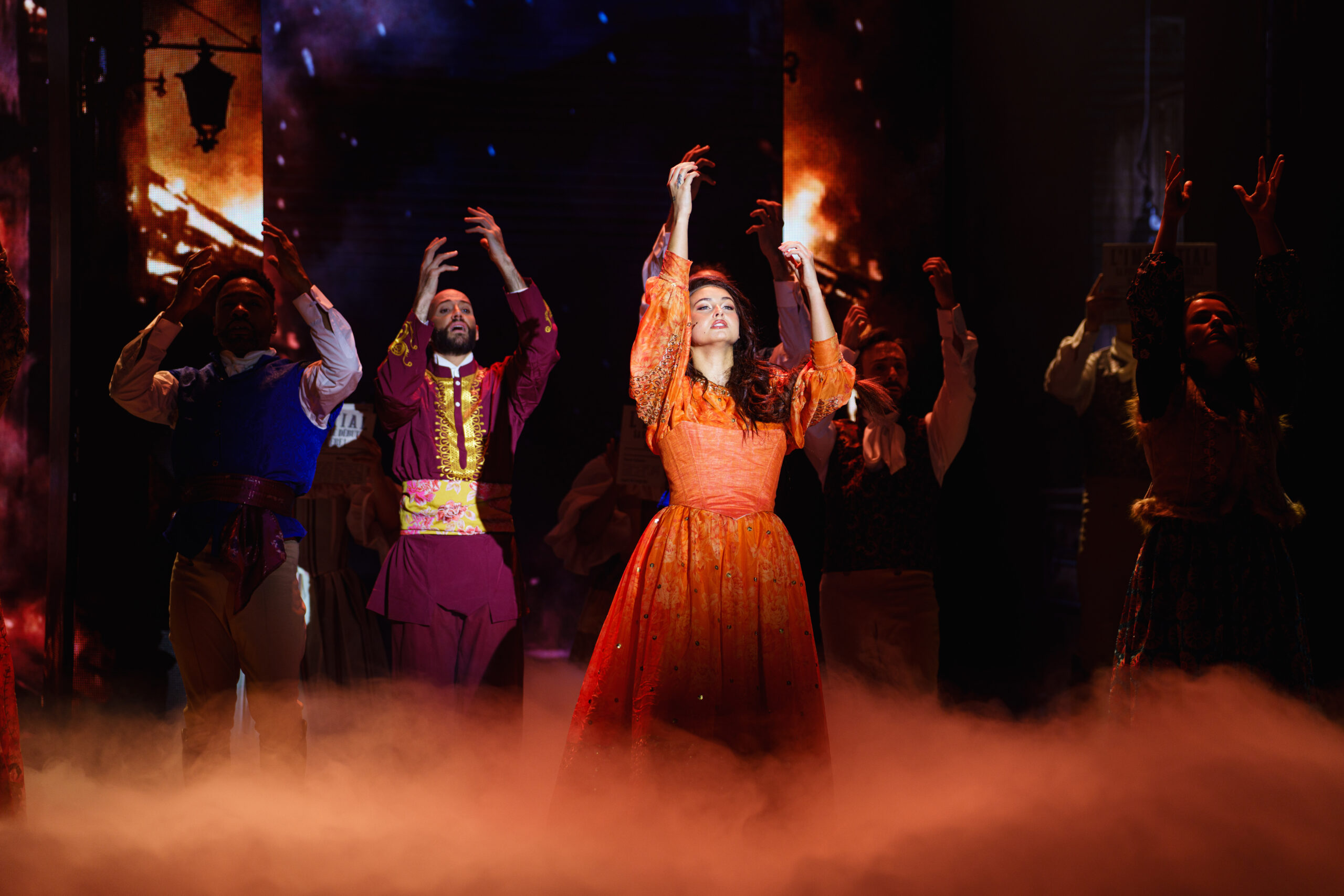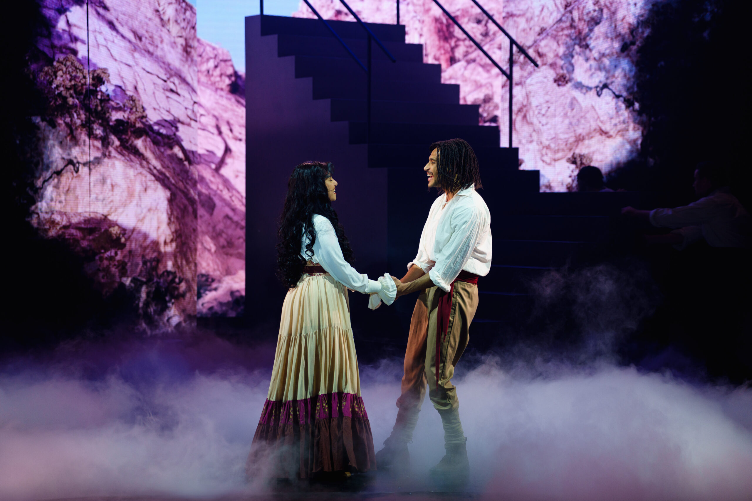 Du côté de la distribution, que nous vous avions révélée en partie au printemps dernier, c’est donc Stanley Kassa (Le Roi Lion ; Les Misérables) qui a la lourde tâche d’endosser le chapeau haut-de-forme du comte de Monte-Cristo, et toutes les autres déclinaisons de son personnage. Il campe un Edmond Dantès charismatique et habité, tour à tour lumineux et torturé. Il est accompagné par Océane Demontis (Le Roi Lion ; Les Misérables) qui incarne Mercédès, le premier amour d’Edmond Dantès, Jade Gaumet (Starmania) dans le rôle d’Haydée, Tatiana Matre (Chat botté, le musical ; Émilie Jolie) pour celui d’Hermine, ou encore Nathan Desnyder (Chat Botté, le Musical ; Rebecca) en Cavalcanti. Le trio d’ennemis jurés d’Edmond est pour sa part interprété par Loïc Suberville (Come From Away ; Company) en Fernand de Morcerf, Cyril Romoli (1789 les Amants de la Bastille ; Colorature, Mrs Jenkins et son pianiste) en Danglars, et Maxime de Toledo (Les Misérables) en Gérard de Villefort. Pour endosser les rôles d’Albert de Morcerf et d’Eugénie Danglars, on retrouve respectivement Antoine Le Provost (Gypsy ; Cher Evan Hansen) et Lila Touchard. De manière globale, la vingtaine d’artistes présents sur scène offre une interprétation maîtrisée, tant au niveau du chant que de la comédie. On retient plus particulièrement le jeu et les moments d’ensemble des 3 « méchants » de l’histoire, ainsi que les envolées vocales habitées de Tatiana Matre. Jade Gaumet, que l’on avait pu découvrir en tant que danseuse sur Starmania, tire également son épingle du jeu côté chant et comédie et mêle d’ailleurs habilement les 3 arts sur l’un des tableaux les plus marquants du spectacle, « L’Orpheline ».